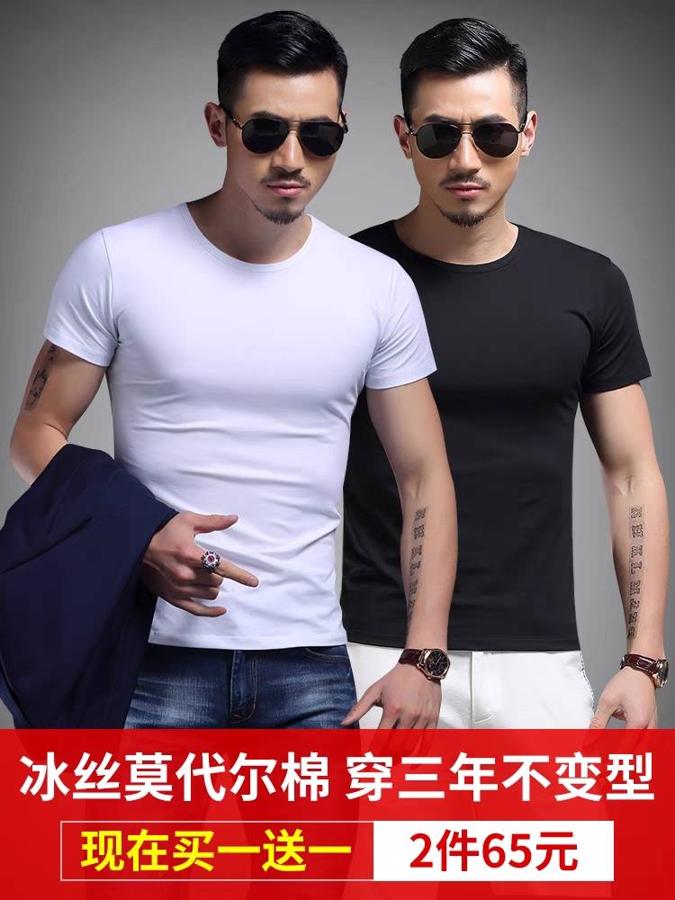2件】莫代尔男士短袖t恤夏春白色紧身打底衫冰丝纯色半袖上衣男装