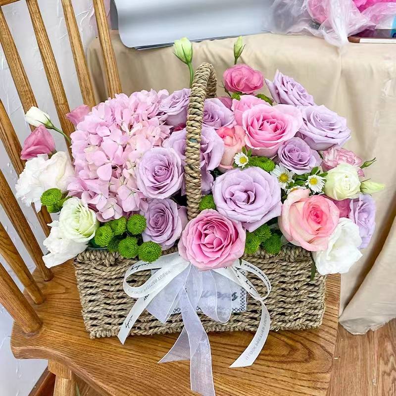 手提花篮康乃馨玫瑰绣球鲜花速递同城生日配送店