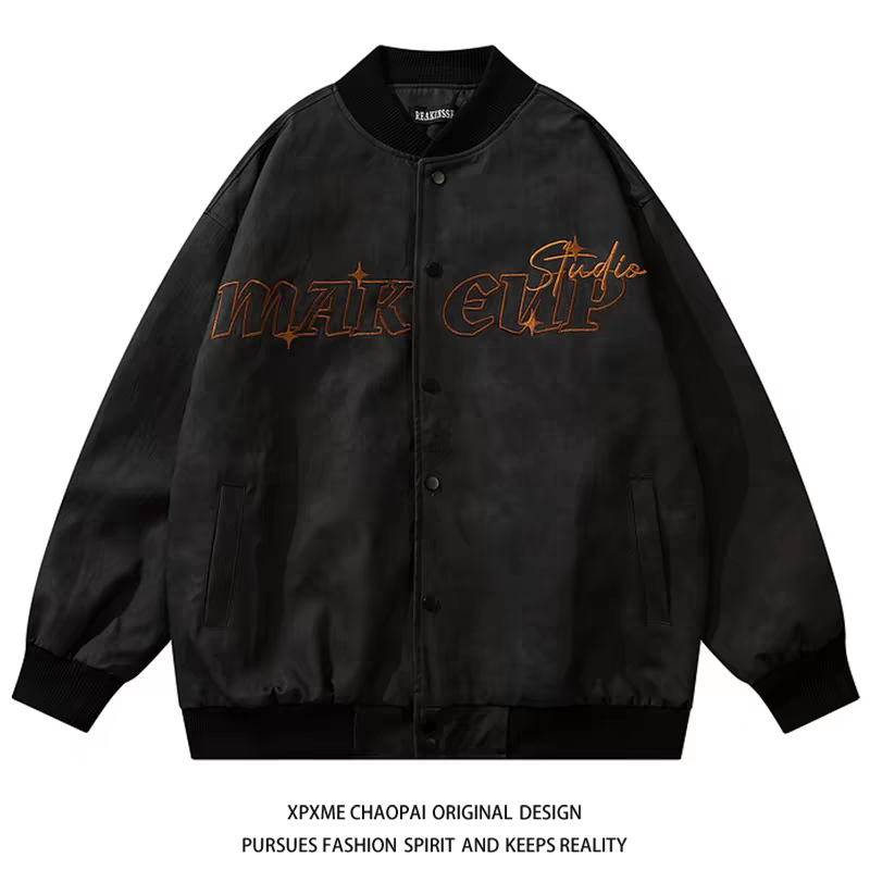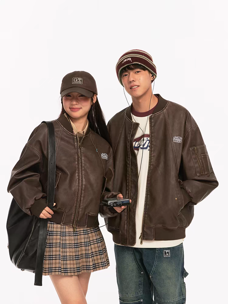 美式复古做旧街头嘻哈PU皮夹克衫棒球服男女同款秋冬外套ins