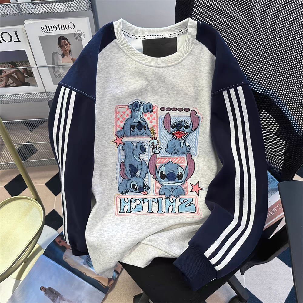 2024新款可爱史迪仔刺绣插肩卫衣男女春秋国潮小个子撞色条纹上衣