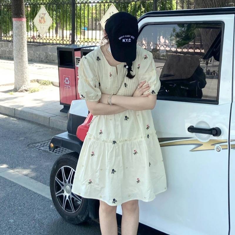 欧货时尚洋气娃娃领连衣裙女2021年夏季新款 气质收腰泡泡袖a字裙