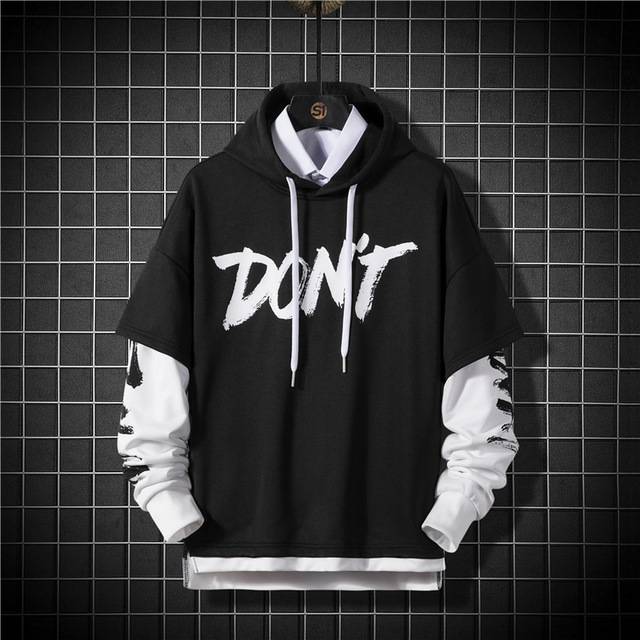男装秋冬时尚休闲字母印花加大码连帽卫衣潮流宽松假两件拼接上衣