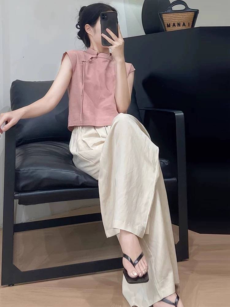 新中式国风粉色旗袍衬衫女夏季2024年新款别致无袖上衣设计感小众