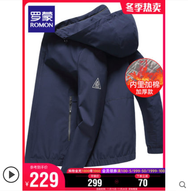 【可拆卸帽】罗蒙加棉加厚短款夹克男士2021秋冬保暖外套休闲上衣