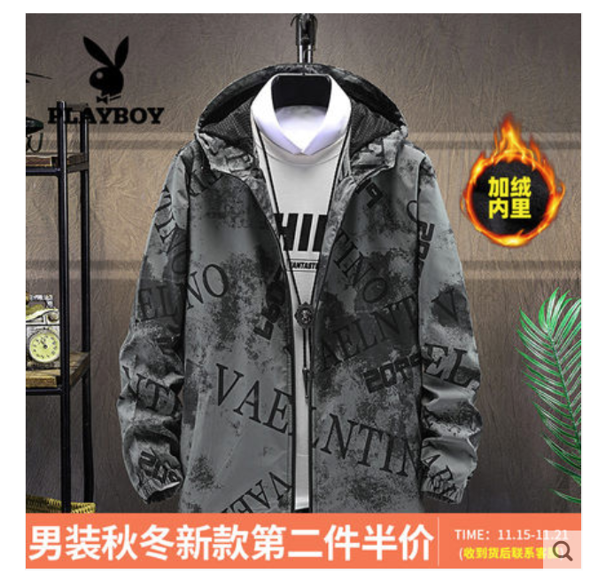 花花公子外套男2021秋季新款男装连帽工装夹克男士上衣加绒衣服潮