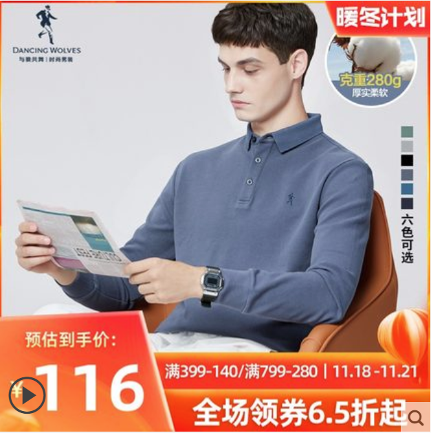 【纯棉厚实】与狼共舞翻领长袖T恤男2021秋季新款舒适男士polo衫