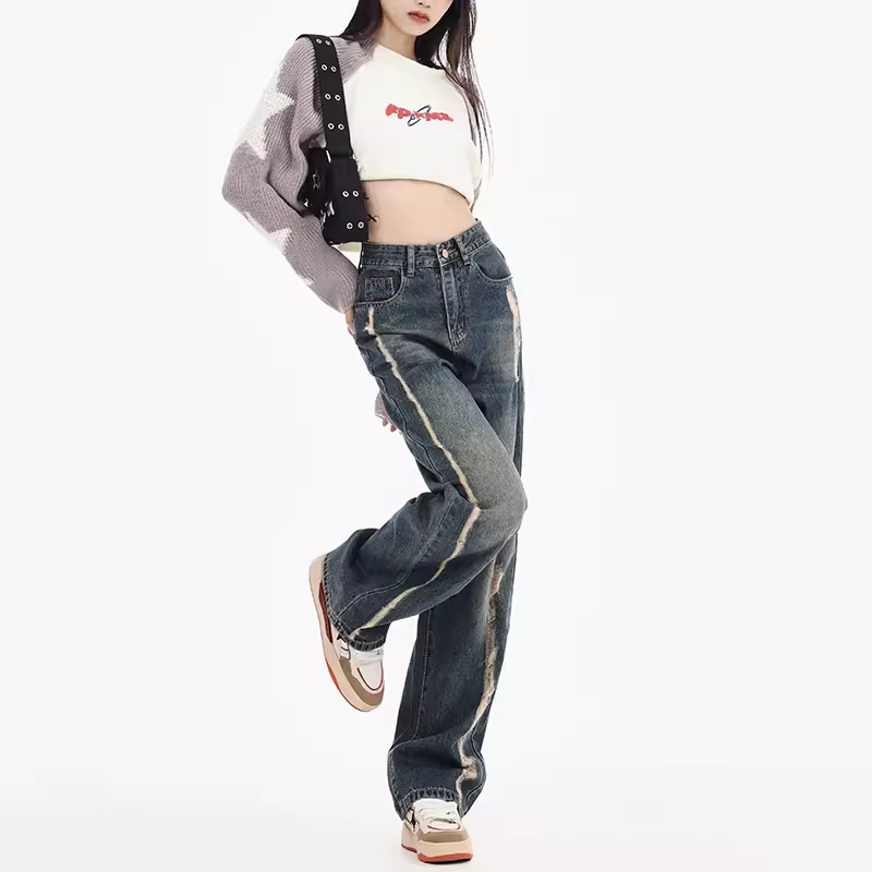 复古显瘦显高阔腿裤高腰牛仔韩版裤直筒裤
