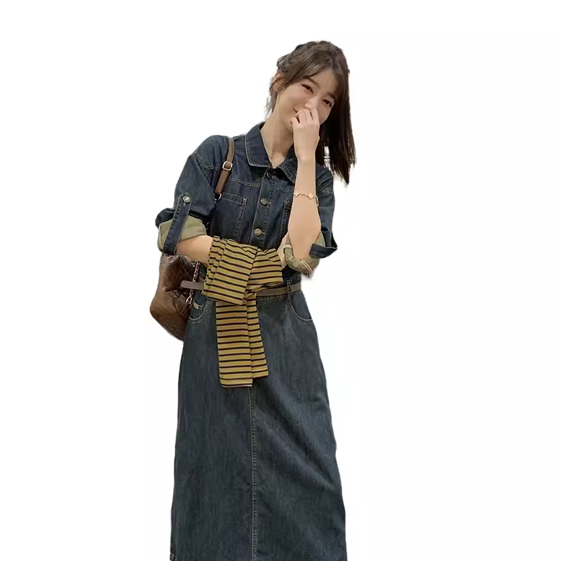 春装新款修身牛仔连衣裙送围巾