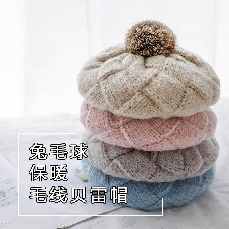秋冬日系保暖加厚针织毛线帽贝雷帽女韩国甜美可爱兔毛球画家帽