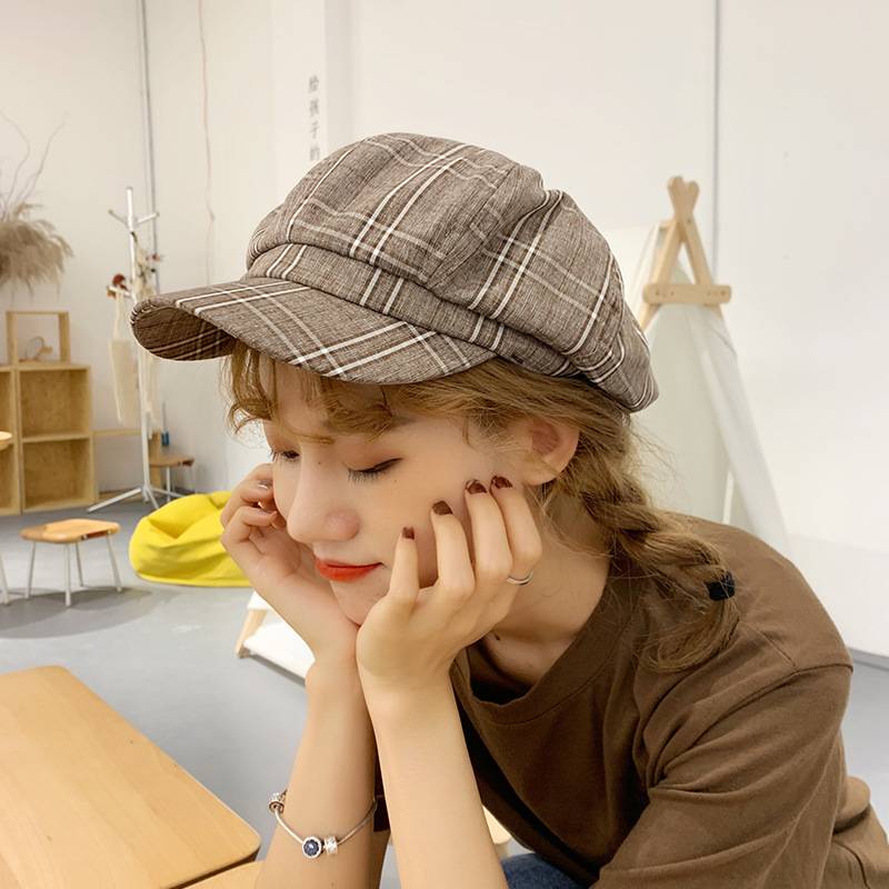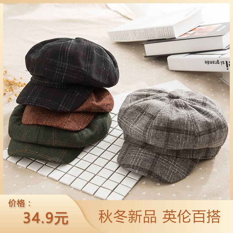 四季都可戴的韩版洋气格子贝雷帽子女软妹可爱画家帽八角帽初秋