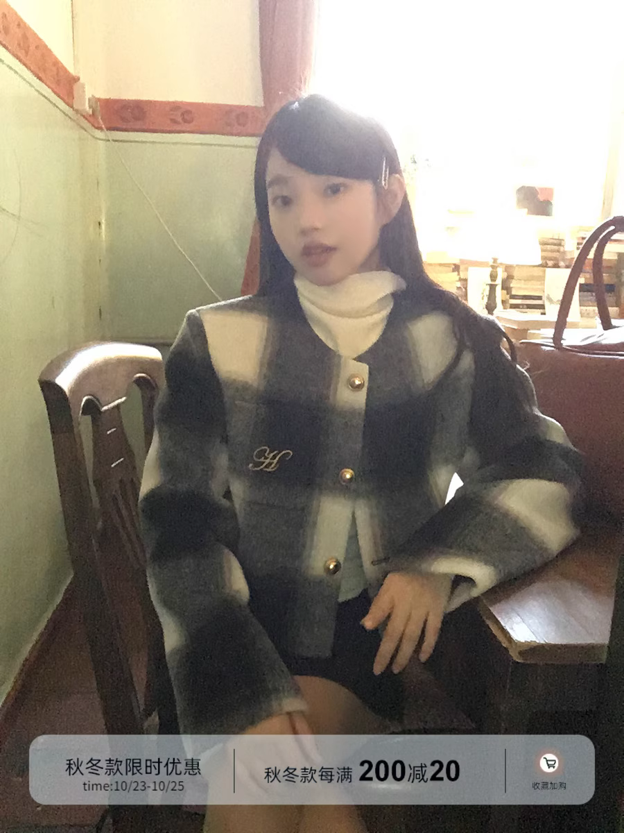 红人馆小香风外套女2023新款爆款秋冬高级感夹棉短款格子毛呢开衫