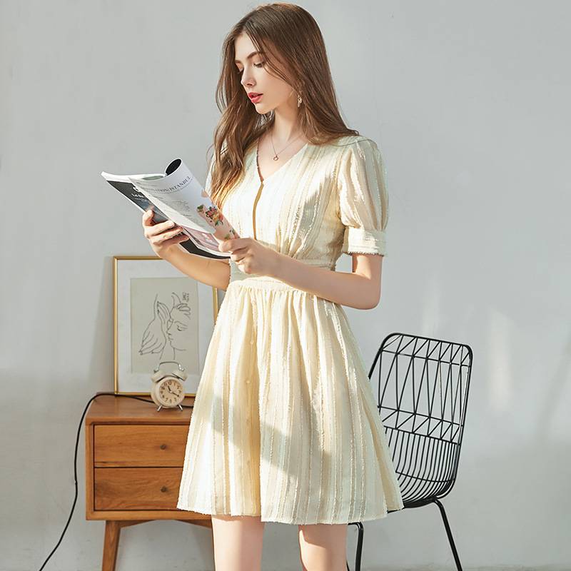 法国小众桔梗裙子女2020夏装新款气质V领单排扣雪纺短袖连衣裙女