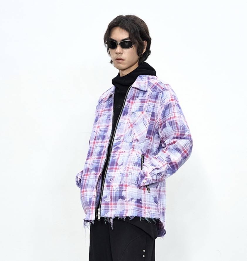ANG 三拉链水洗破坏格子衬衫男秋冬夹克cleanfit格纹外套潮