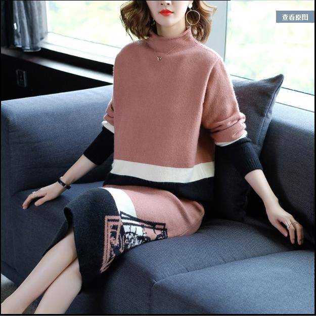 时尚针织套装连衣裙女2018秋装新款毛衣包臀保暖连衣裙两件套打折