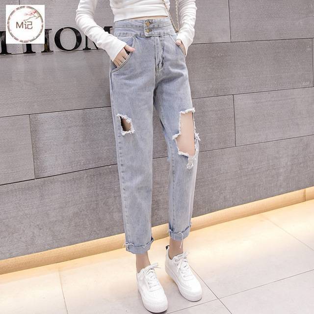 2020夏季新款宽松高腰九分直筒破洞乞丐牛仔裤女装