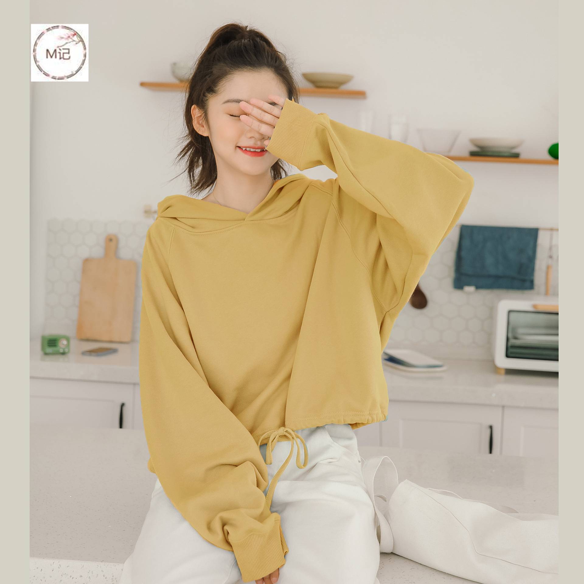 2020秋季新款ins韩版宽松纯色连帽系带短款全棉卫衣