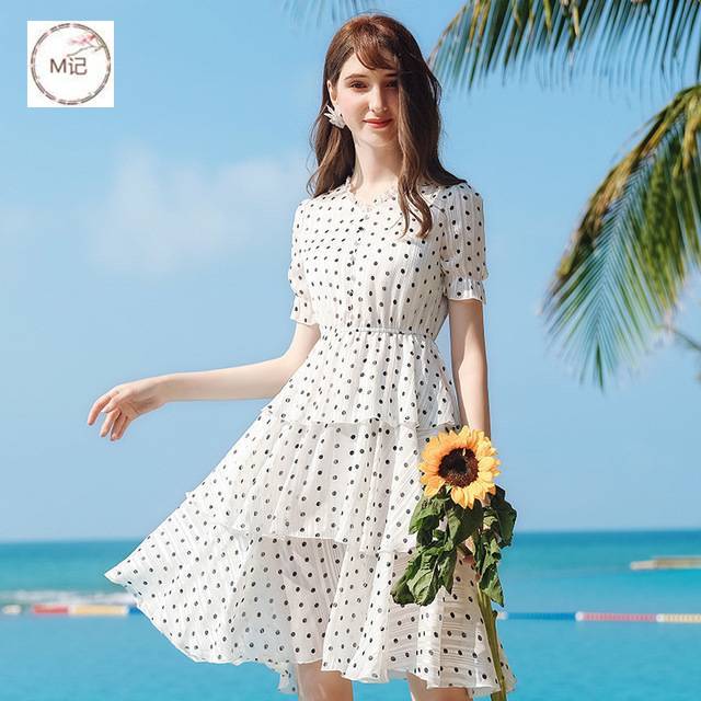 2020夏季新款品牌女装v领波点荷叶边裙气质轻熟雪纺连衣裙