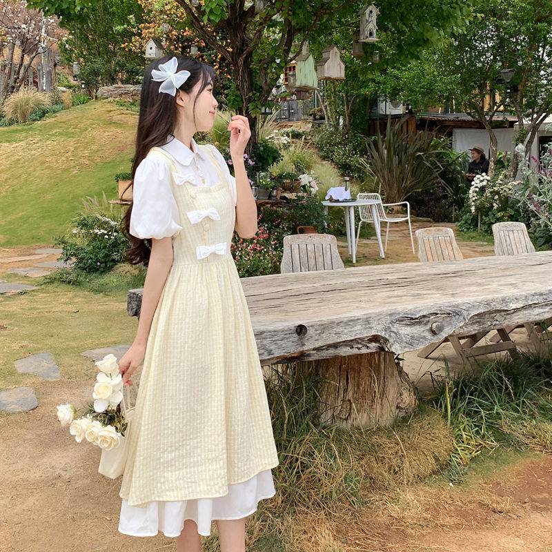 法式复古假两件连衣裙女2023夏新款学院风甜美小个子森系初恋裙子