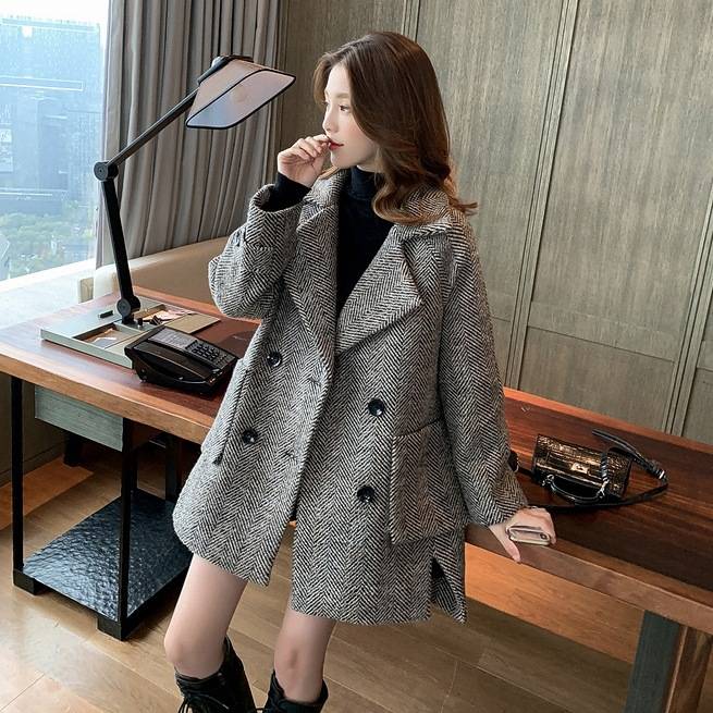 2021秋冬季复古西装领夹棉加厚小个子毛呢中长款双排扣大衣外套女