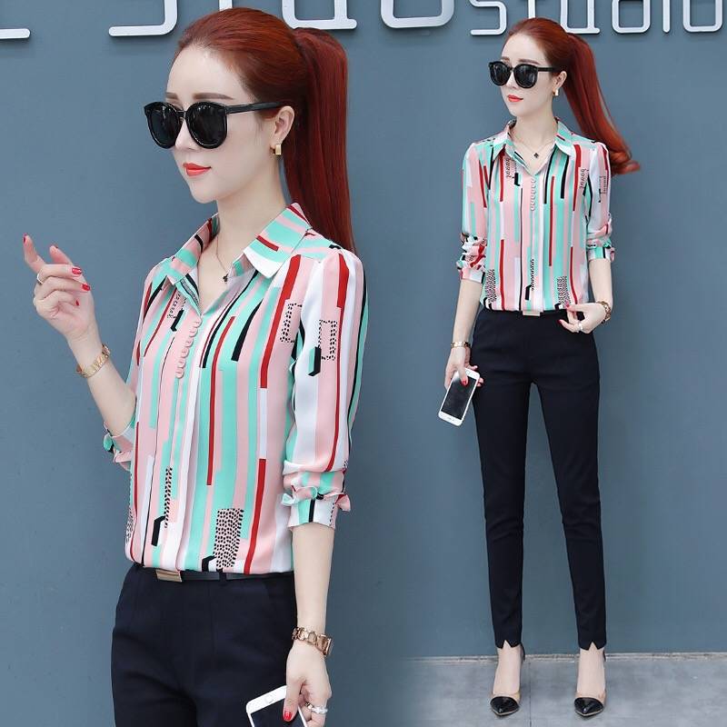 早秋装条纹雪纺衬衫女装初秋长袖衬衣2018春装新款秋天上衣服