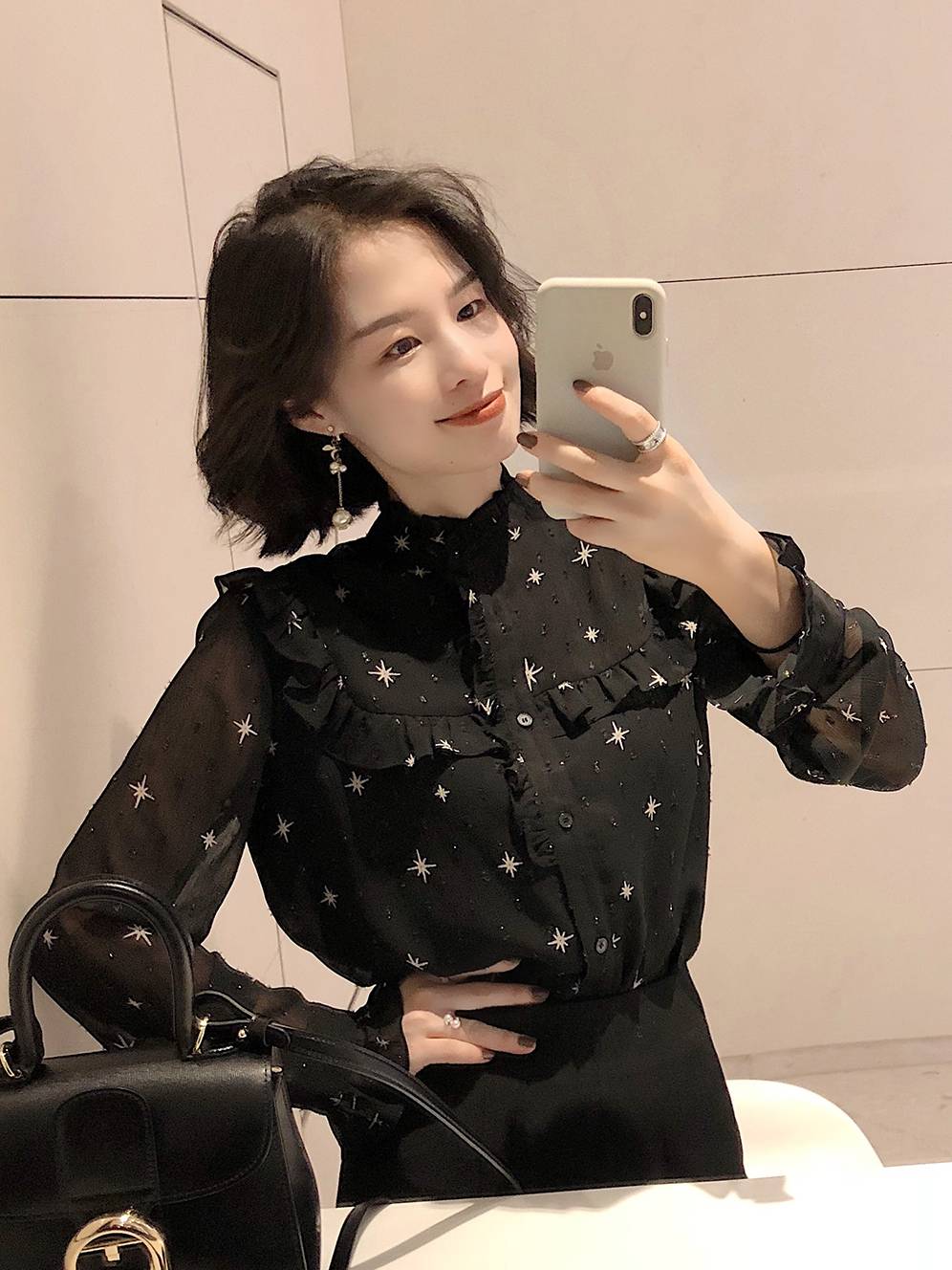雪纺连衣裙女秋装2018新款黑色星星印花裙长袖衬衫裙子L317