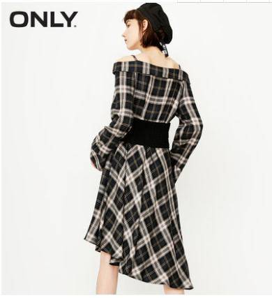 2018秋季新款一字领格子长袖连衣裙女