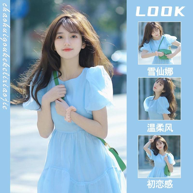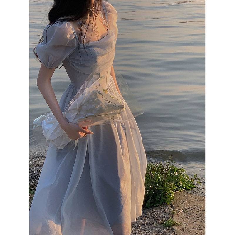 法式初恋温柔蓝色连衣裙在逃公主甜美长裙夏季高级感收腰奶甜裙子