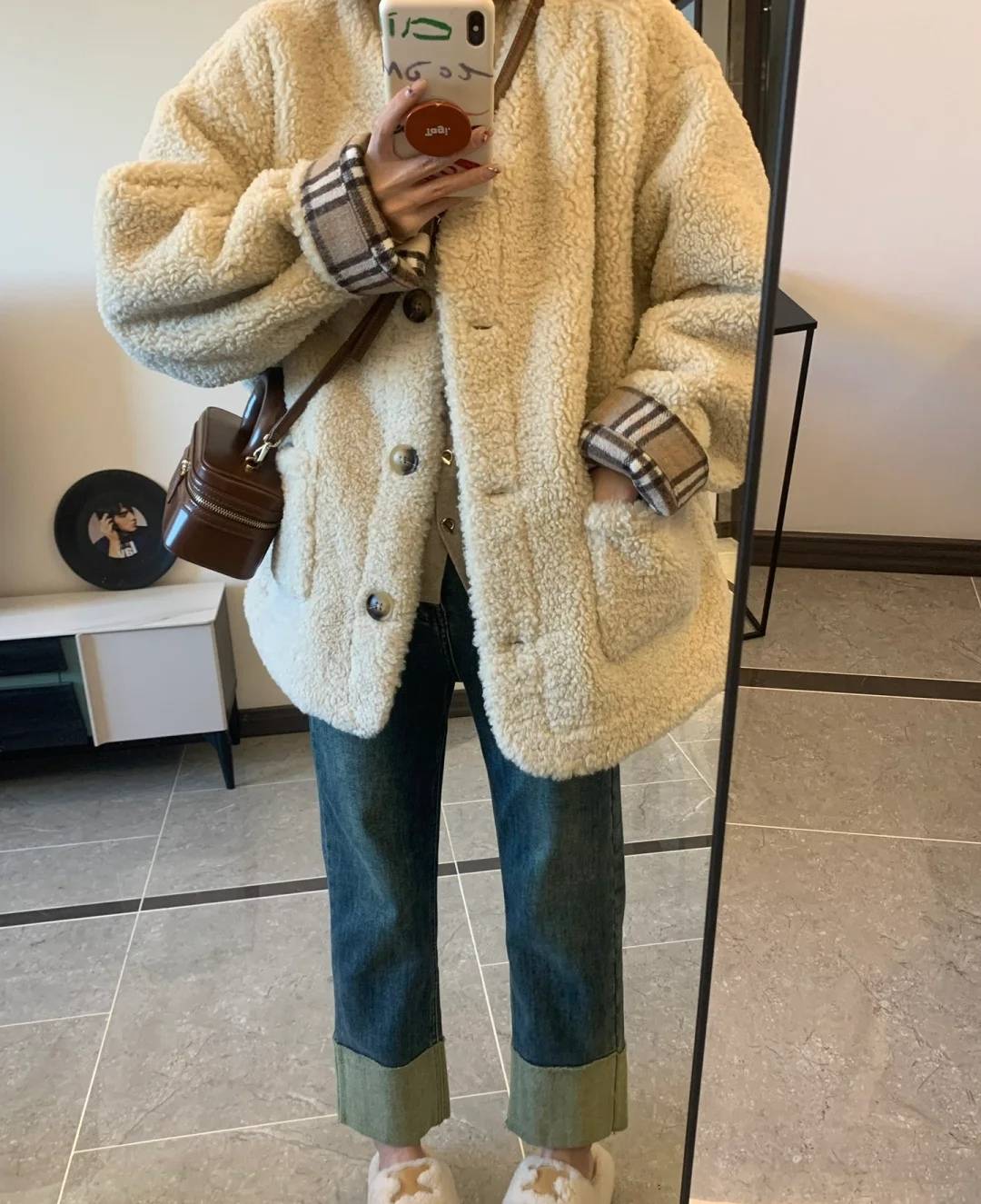 阿茶与阿古2018秋季温柔韩风简约新款米色毛绒针织开衫毛衣