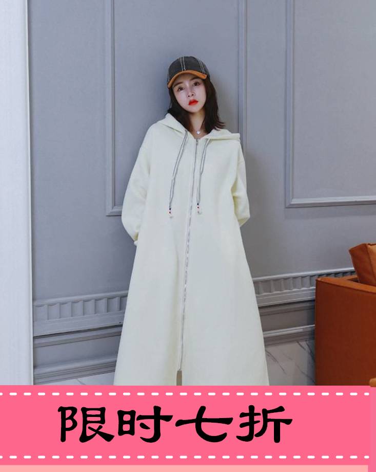 连帽卫衣女加厚加绒冬季长款过膝白色卫衣外套上衣