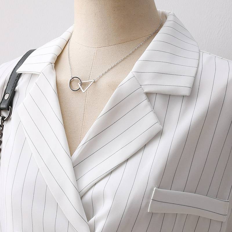 2019夏新款双排扣设计感条纹衬衫女短袖韩版职业OL西装领洋气衬衣