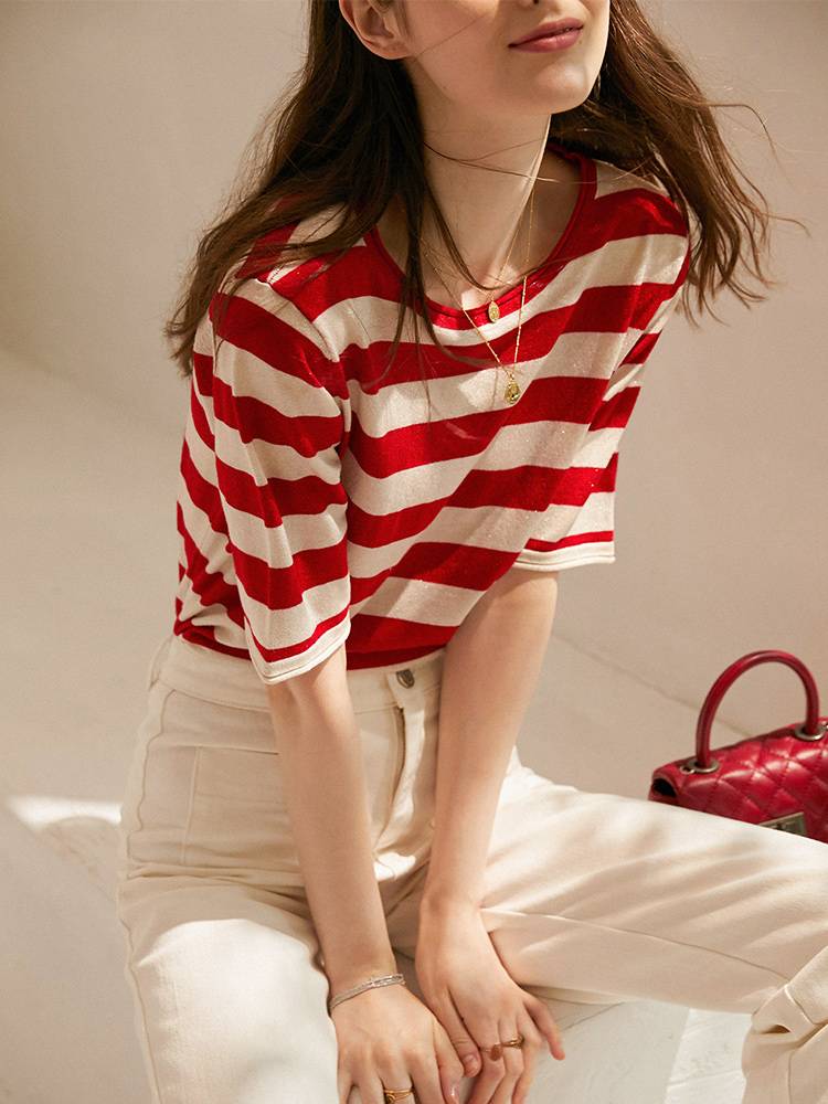 秘密盒子 奇妙趣味2019新款夏法式休闲复古条纹直筒圆领短袖T恤女