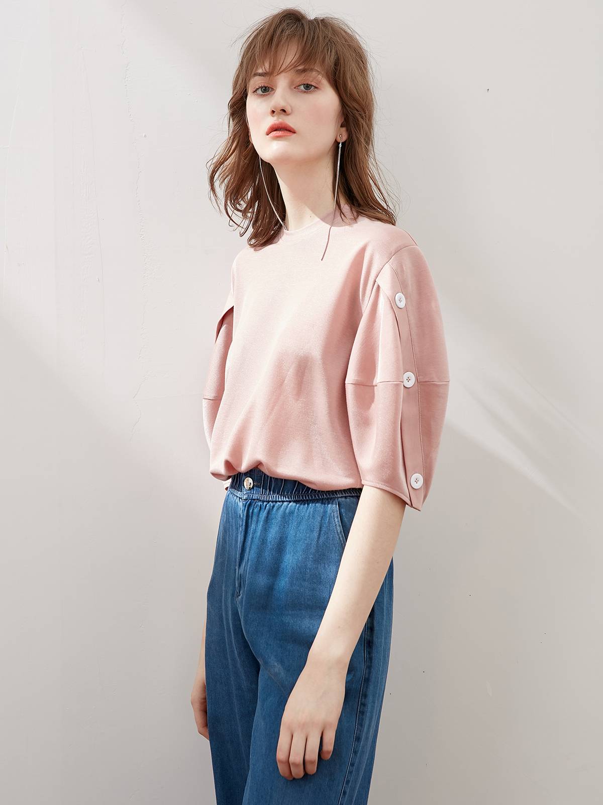 OPOF复古灯笼袖T恤女宽松独特设计纽扣装饰颜色靓丽出众2019夏新