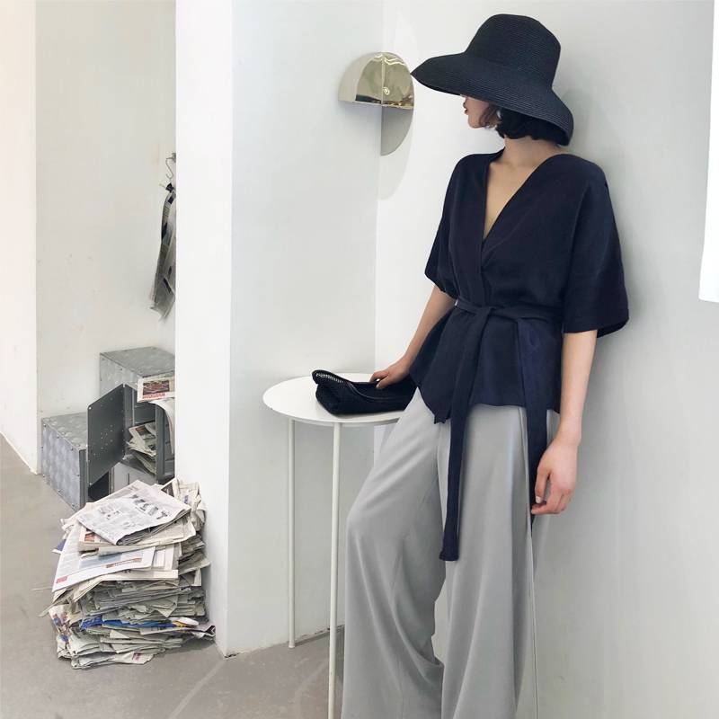 ADA MISS宽松短款显瘦交叉V领收腰绑带短袖衬衫上衣女夏2019新款