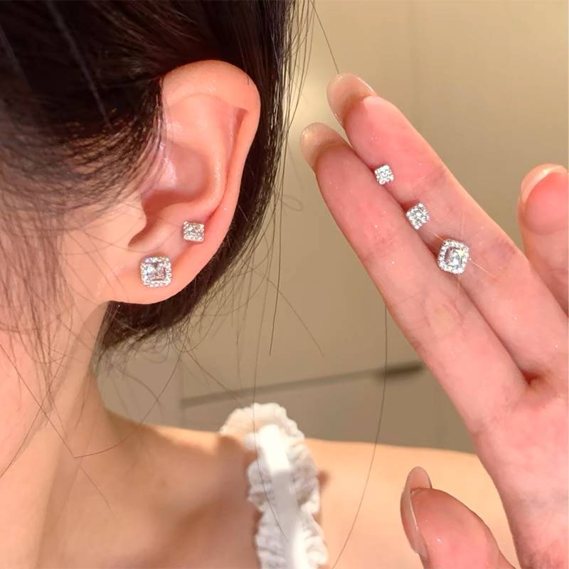 通体925银小方糖闪锆养耳洞耳钉女轻奢高级感耳饰女睡觉免摘耳环