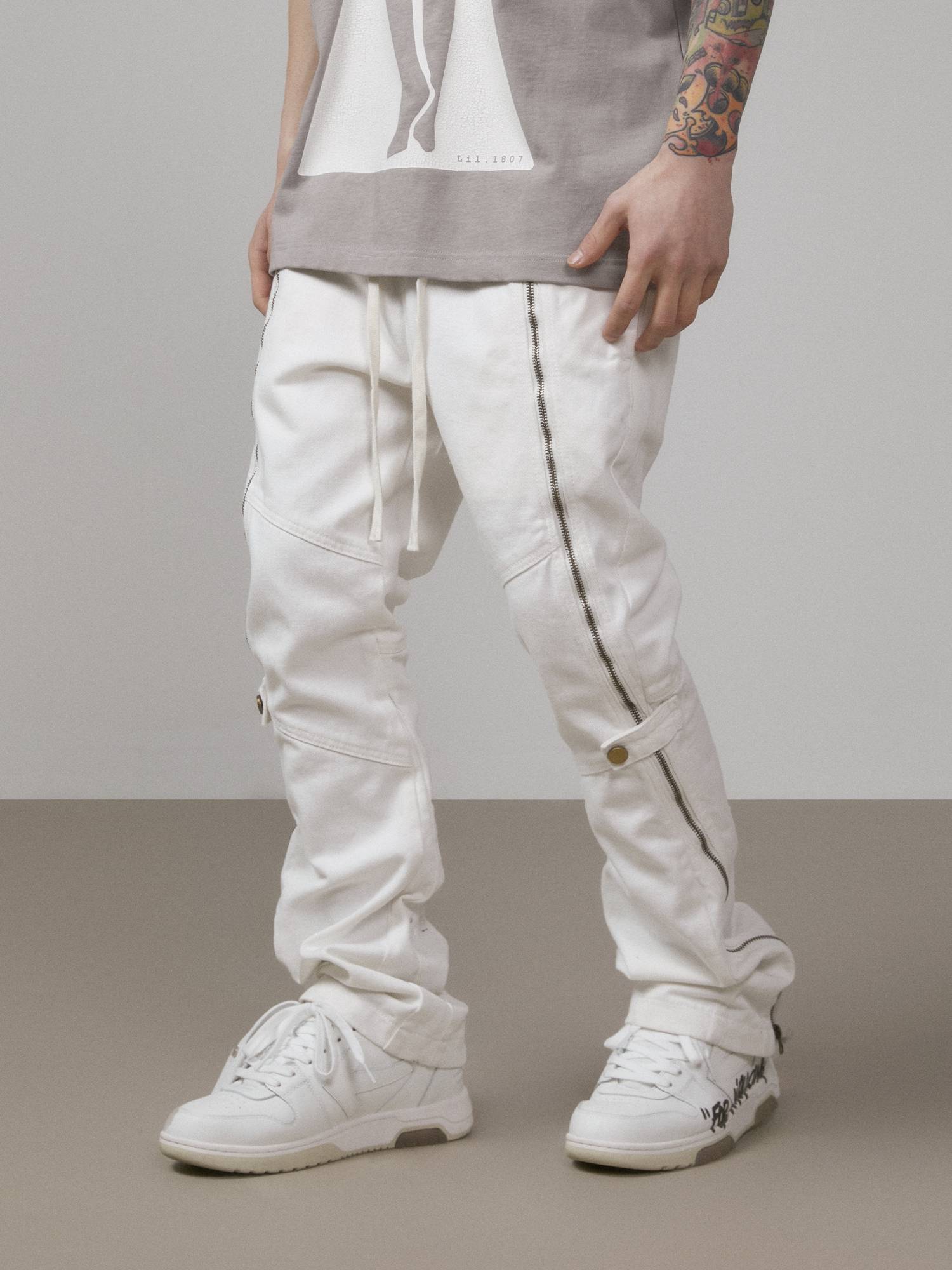 1807 2022新款白色斜纹布修身微喇长裤男女拉链结构休闲长裤下装
