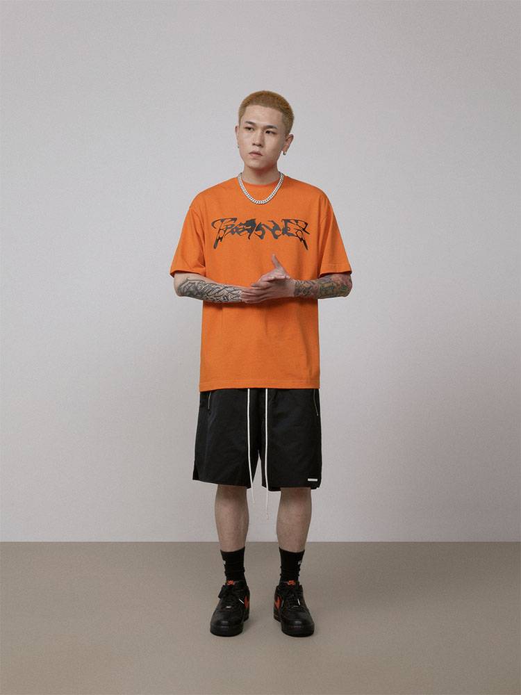 1807 夏季新款黑橘色蝴蝶字体印花短袖男宽松休闲美式t恤上衣情侣