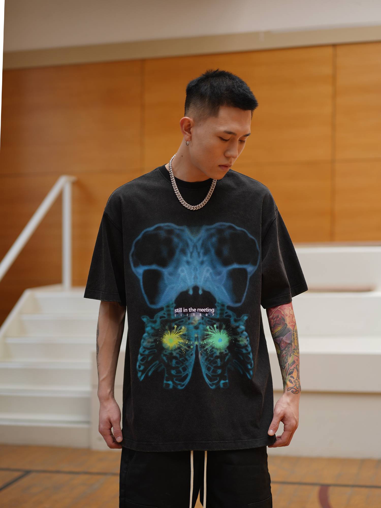 1807 双人骨炒花短袖t恤男女夏季新款做旧美式街头五分袖宽松打底