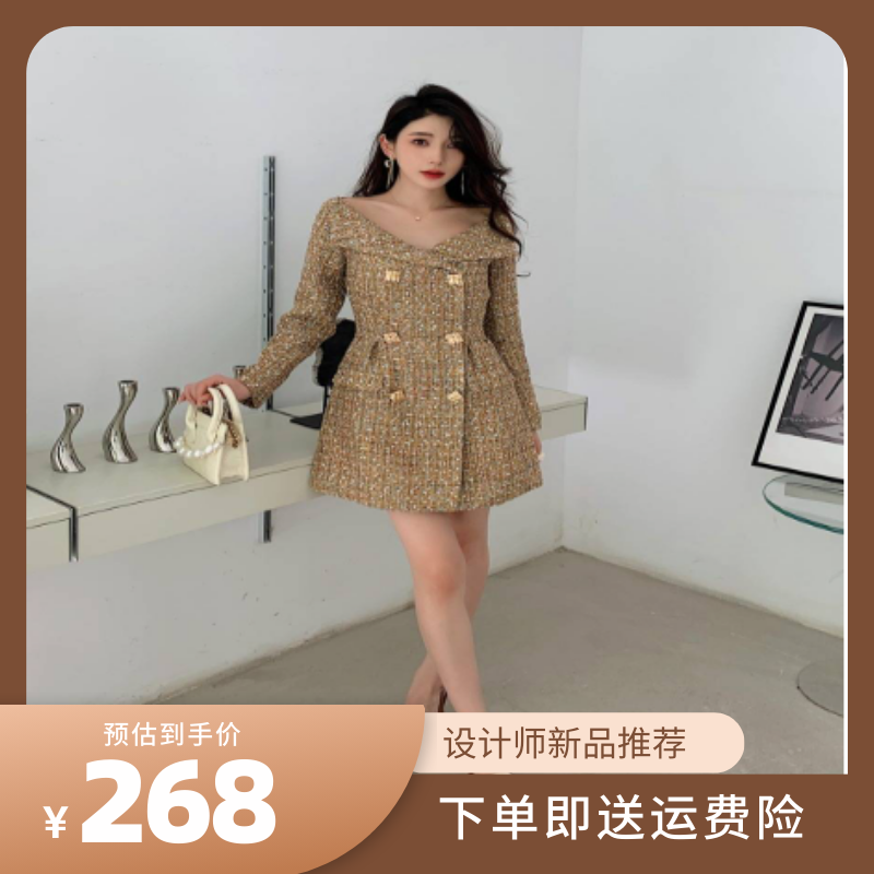 粗花呢复古小香风2023秋冬金色气质优雅露肩收腰长袖短裙连衣裙子