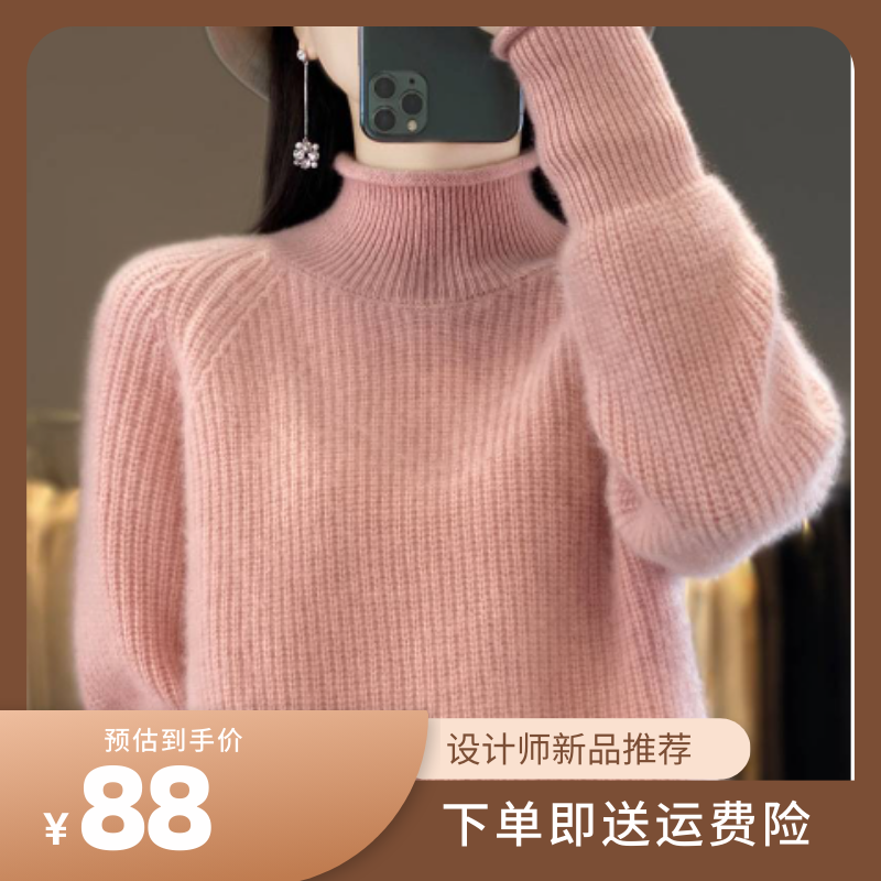 卷边半高领羊毛衫女七针加厚元宝针纯色宽松羊毛针织衫毛衣