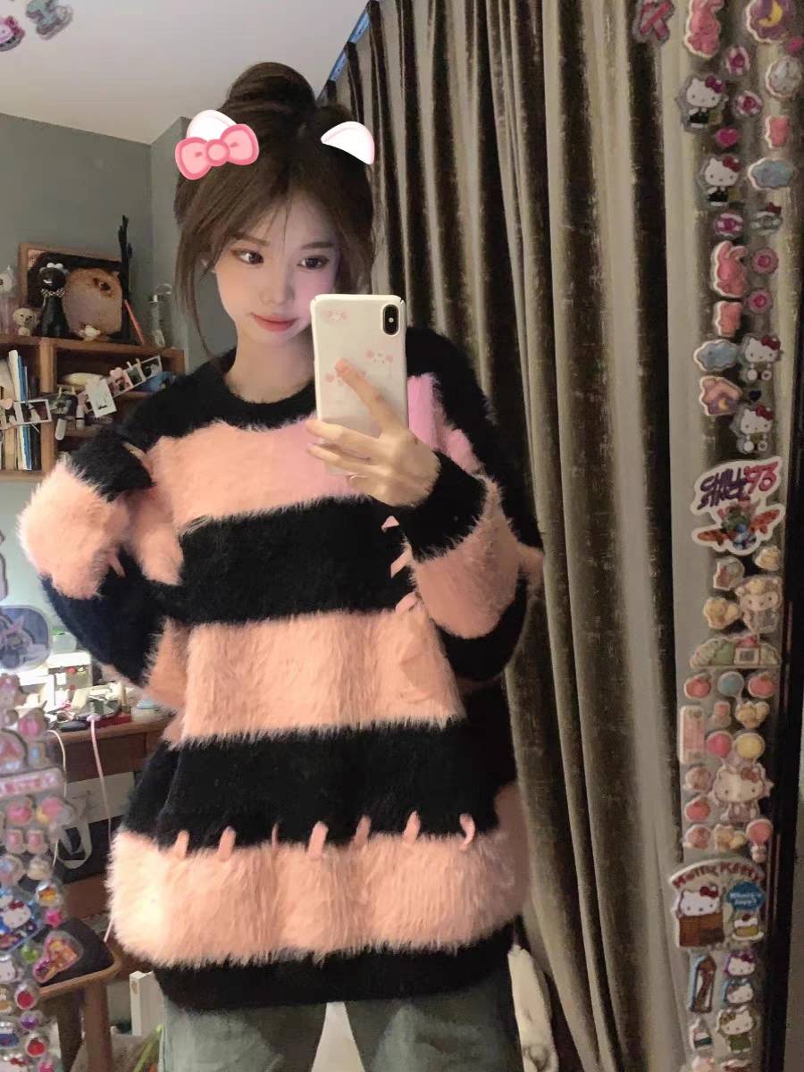 软糯水貂绒条纹撞色毛衣女秋冬季宽松设计感小众慵懒风针织衫上衣