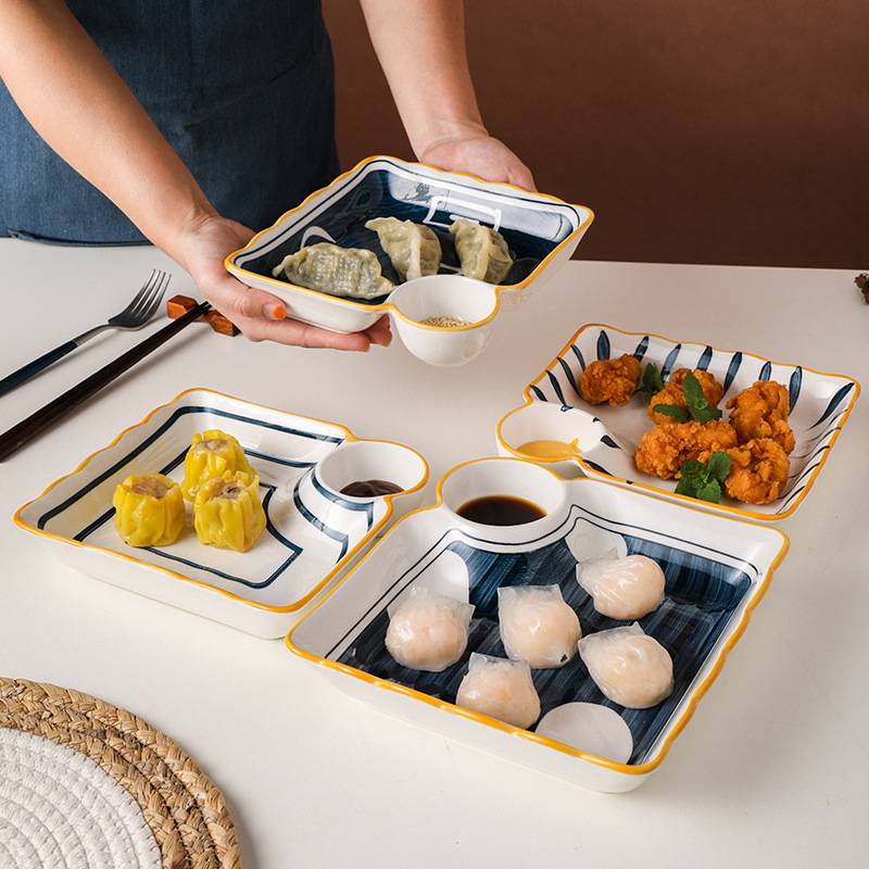 网红日式创意ins陶瓷饺子盘餐具带醋碟一体水饺盘子甜品盘寿司盘