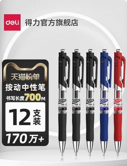 得力笔中性笔按动笔黑蓝红色学生用0.5子弹头