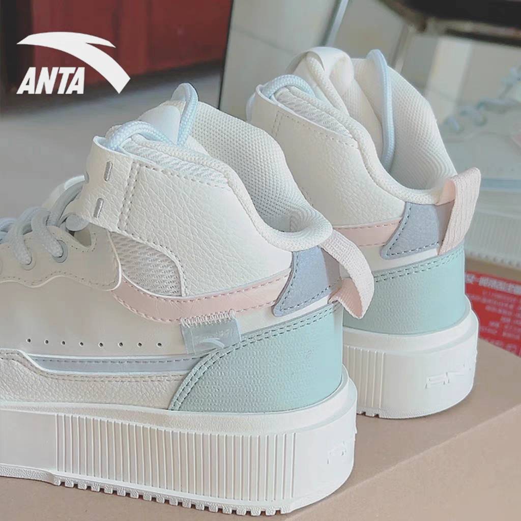 安踏高帮板鞋女鞋官网旗舰春季新款皮面百搭学生奶盖马卡龙休闲鞋