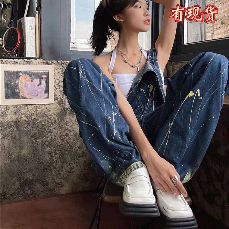 昆白泼墨牛仔背带裤子女夏季薄款ins潮美式hiphop高街工装阔腿裤