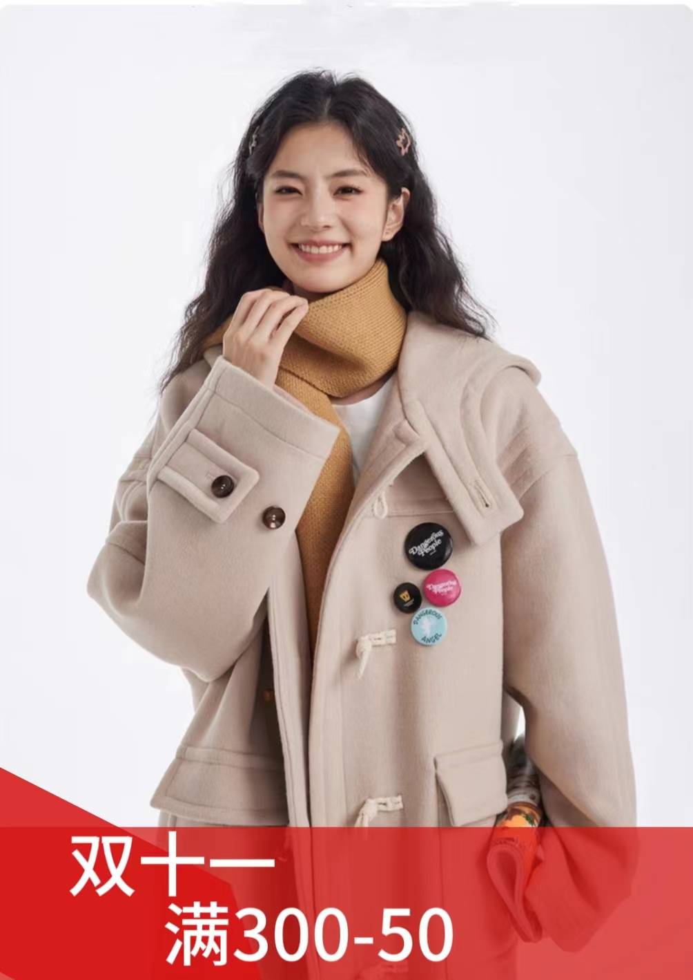 2023明星同款重工牛角扣中长款宽松潮流连帽毛呢大衣