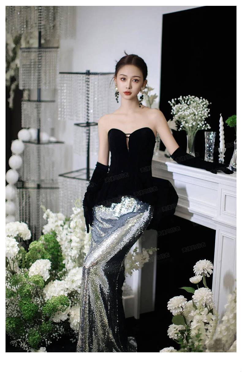 时髦撞色 黑色新娘结婚敬酒服婚纱晨袍生日演出主持人晚礼服19719