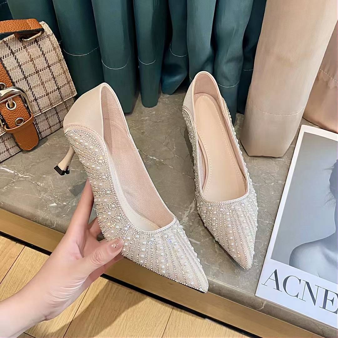 集鞋汇2022年春秋季新款百搭气质名媛珍珠水钻细跟尖头单鞋