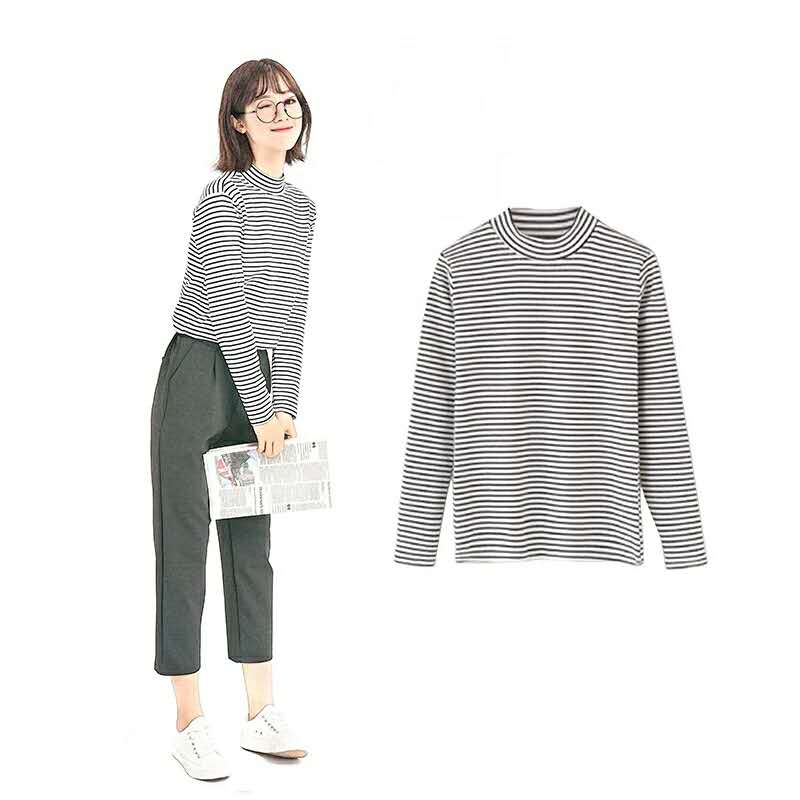 秋季纯棉内搭小半高领黑白条纹打底衫女 韩版百搭修身长袖T恤上衣