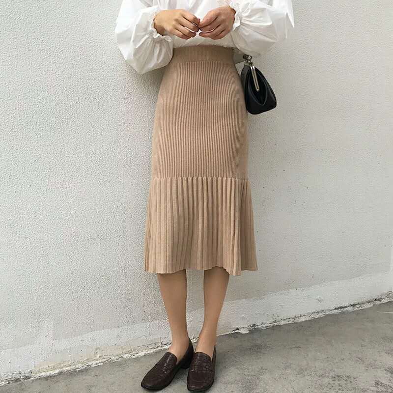 夏秋新款2018慵懒风韩版女装纯色褶皱中长款针织鱼尾半身裙学生潮