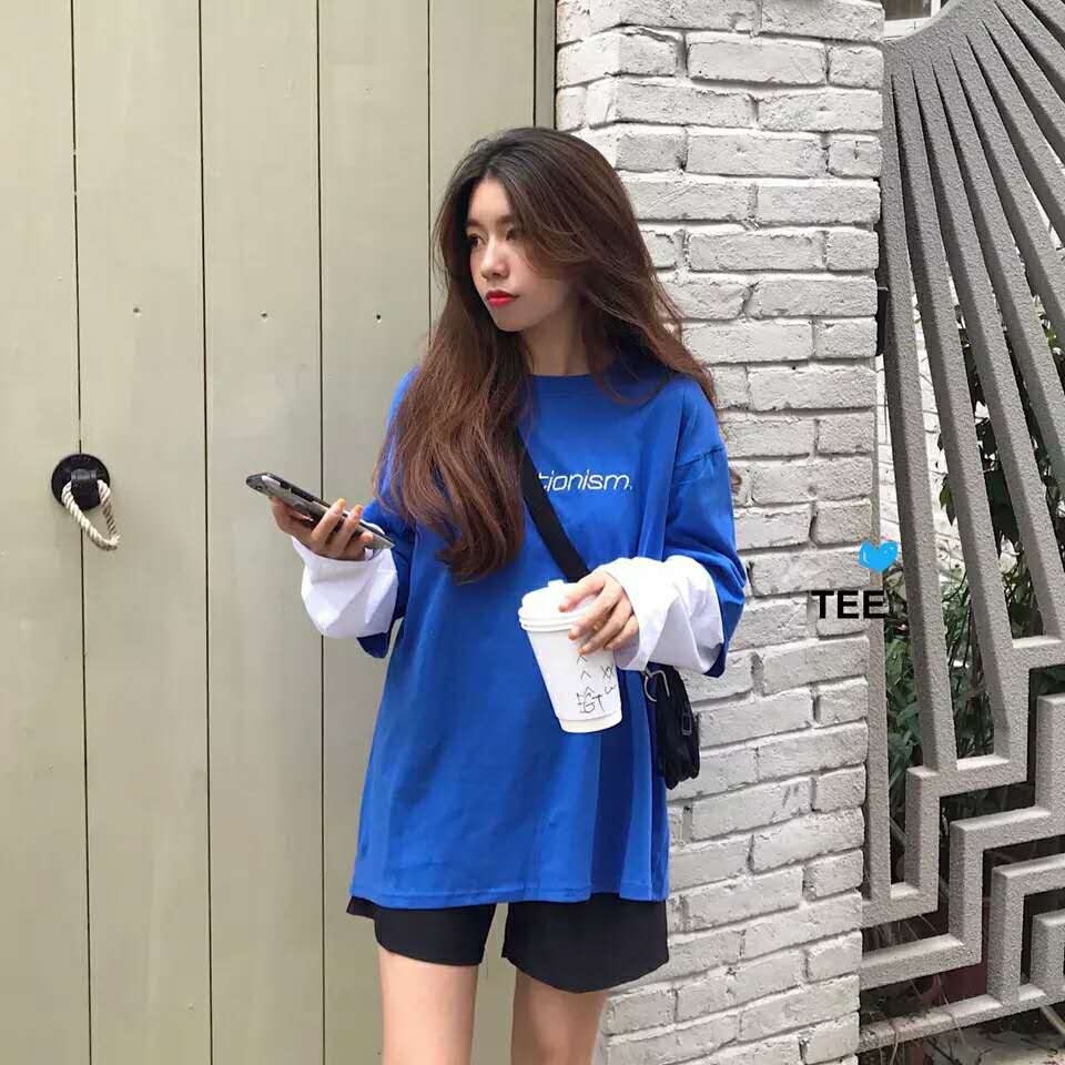 韩版秋季宽松长袖假两件T恤学生百搭显瘦新潮字母印花拼接上衣女